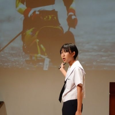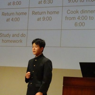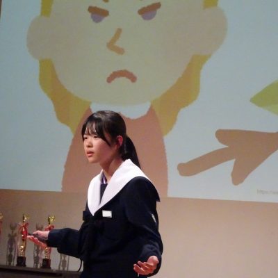 来賓の講師の方に審査及び講評をしていただきました。参加した生徒にとって、英語による表現力と、コミュニケーション能力を高めるよい機会となりました。また、安城市内の仲間の思いや考えを聞くことで、視野を広げ、これからの英語学習への意欲をさらに高めました。
